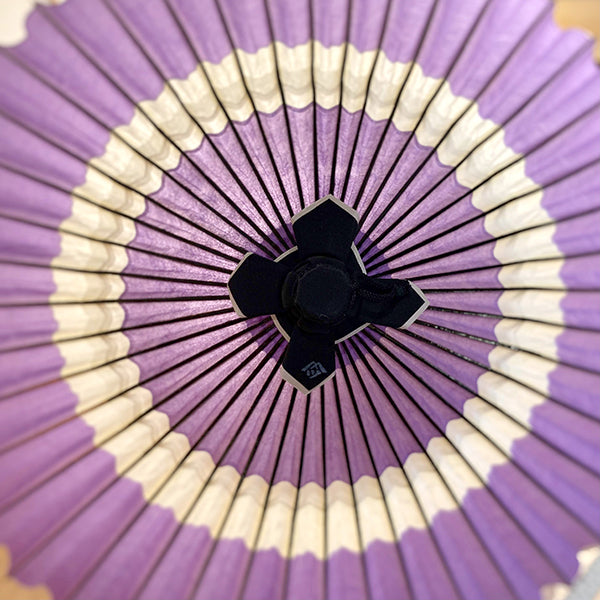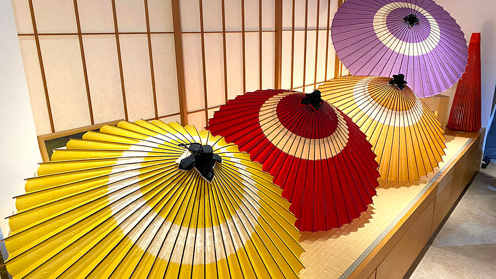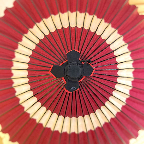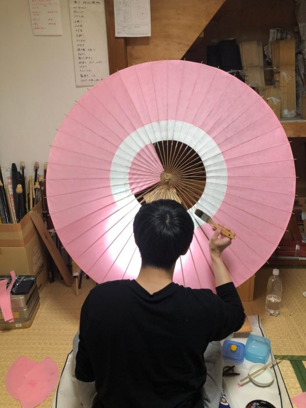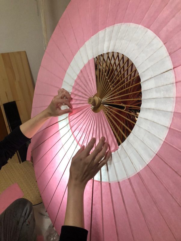 蛇の目柄は和紙を円にカットして、それを三重に貼り合わせるという大変難しい作業工程があります。