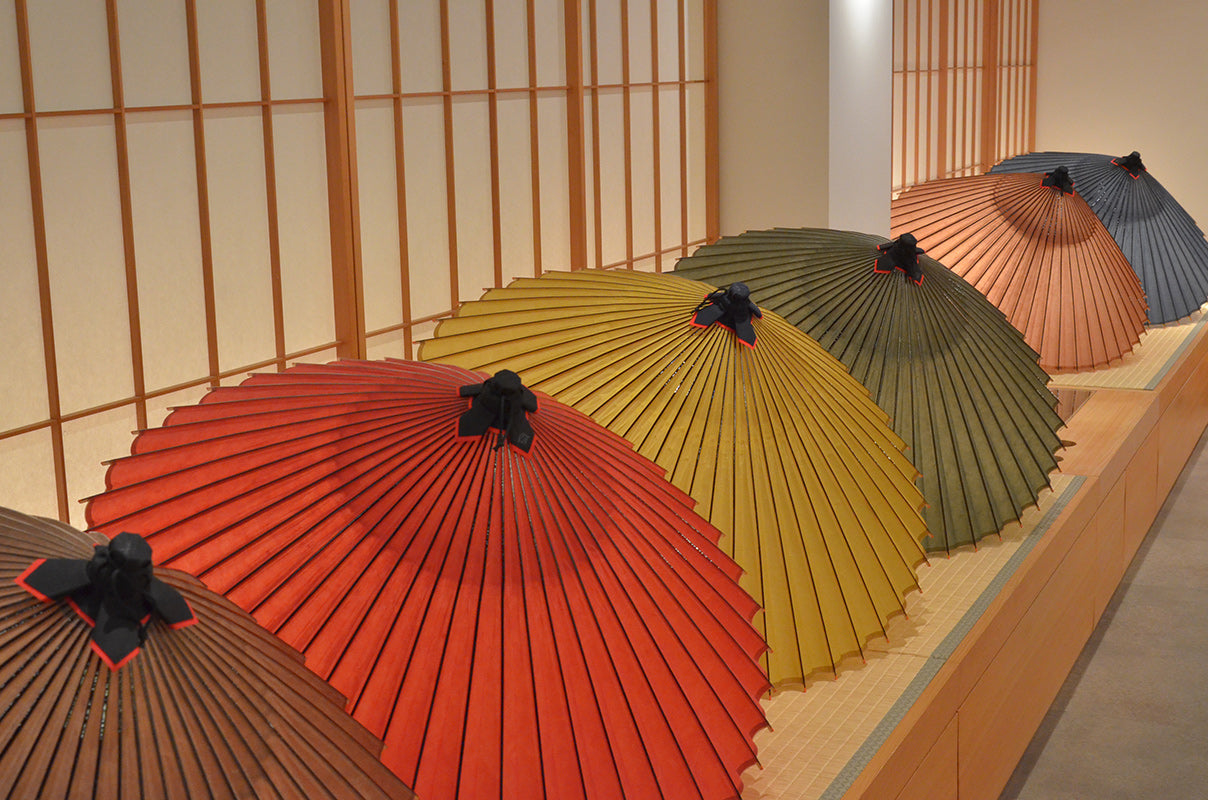 この和紙との出会いにより、美しい詫び色の和傘ができ上りました。その色を引き立てる傘骨の漆は、何度も塗り重ねられ端正な姿へ輝きを放ちます。選び抜いた原料と卓越した技術をもつ職人によって仕立てられた和傘は、丈夫なのはもちろんの事、立ち姿の大変美しい和傘に仕上がります。